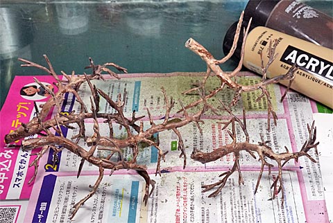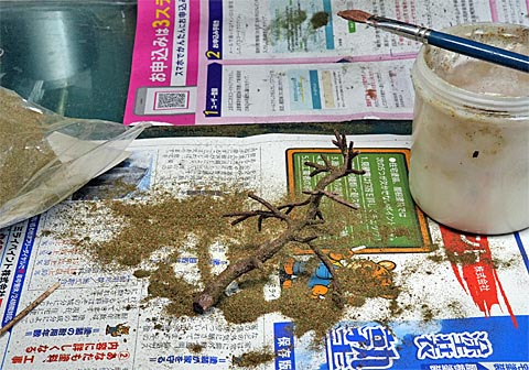 やってみると枝が少なくてボリューム感が不足するので、木工ボンド水溶液を染み込ませる